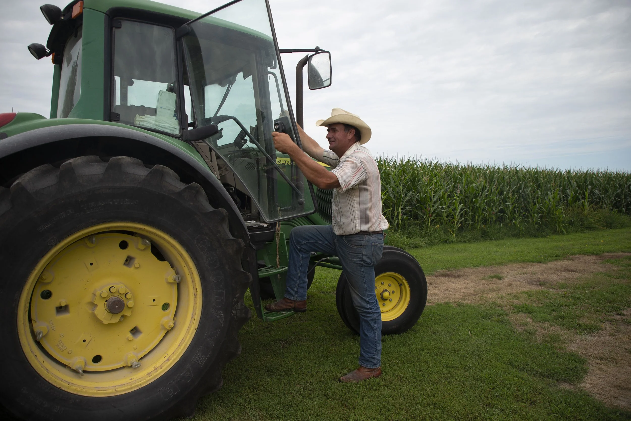 Iowa farmer Steve Swenka poses for a portrait on his tractor at 2 Angus Farms in Tiffin, Iowa on July 25, 2022.
