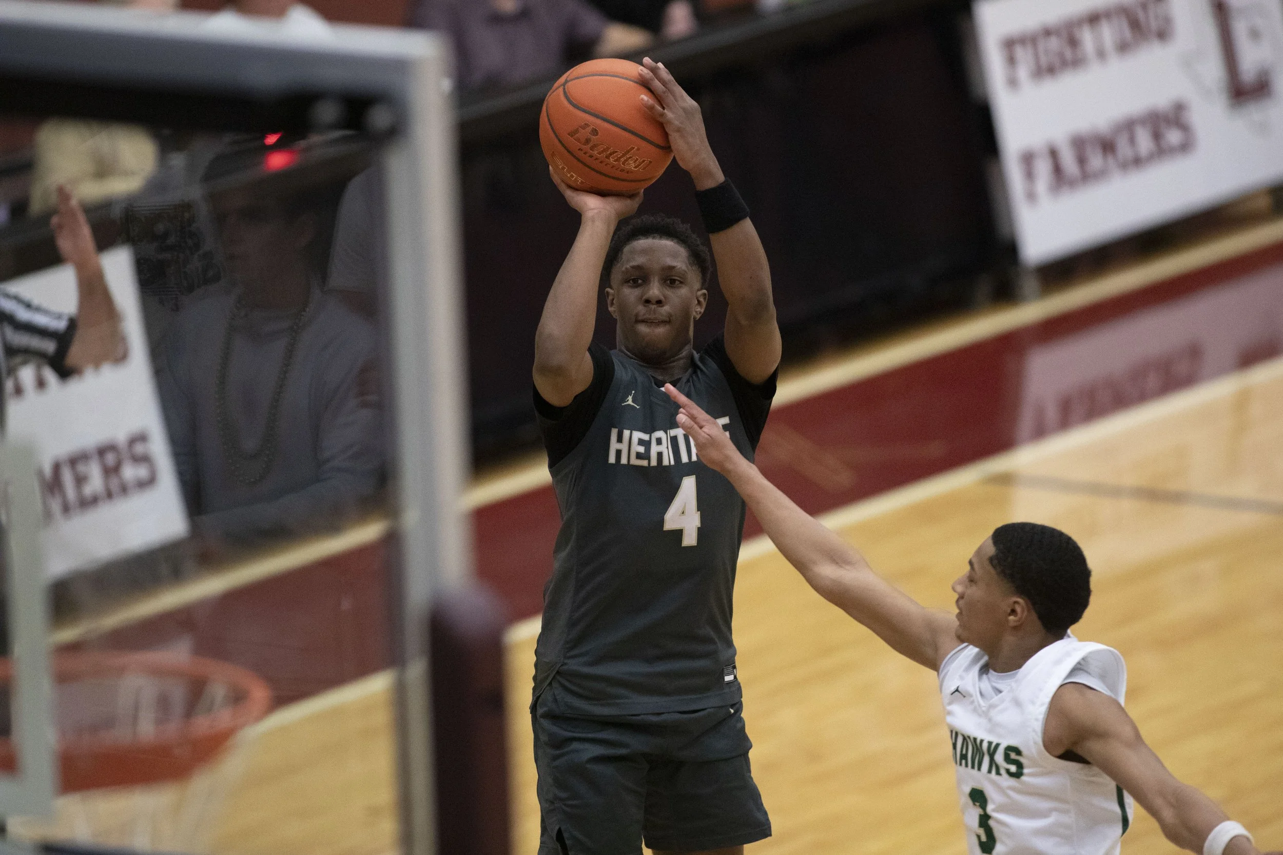 Heritage junior Cameron Lomax shoots a three-point shot during a UIL Boys basketball Class 5A District 1 semifinal game against Birdville at Lewisville High School on Tuesday, March 4, 2025 in Lewisville, Texas. (Daniel McGregor-Huyer/Star Local Media)