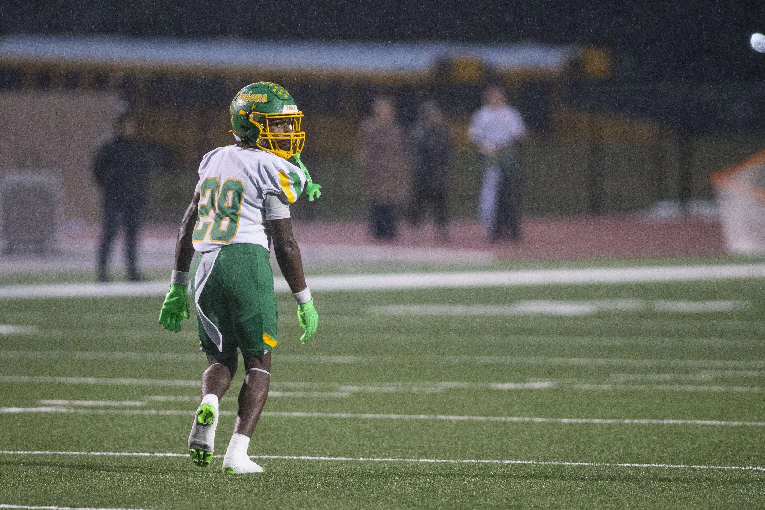 Newman Smith safety Lamond Allison Jr. walks onto the field during a game against the Creekview Mustangs at Standridge Stadium in Carrollton, Texas on November 8, 2024. (Daniel McGregor Huyer/Star Local Media)