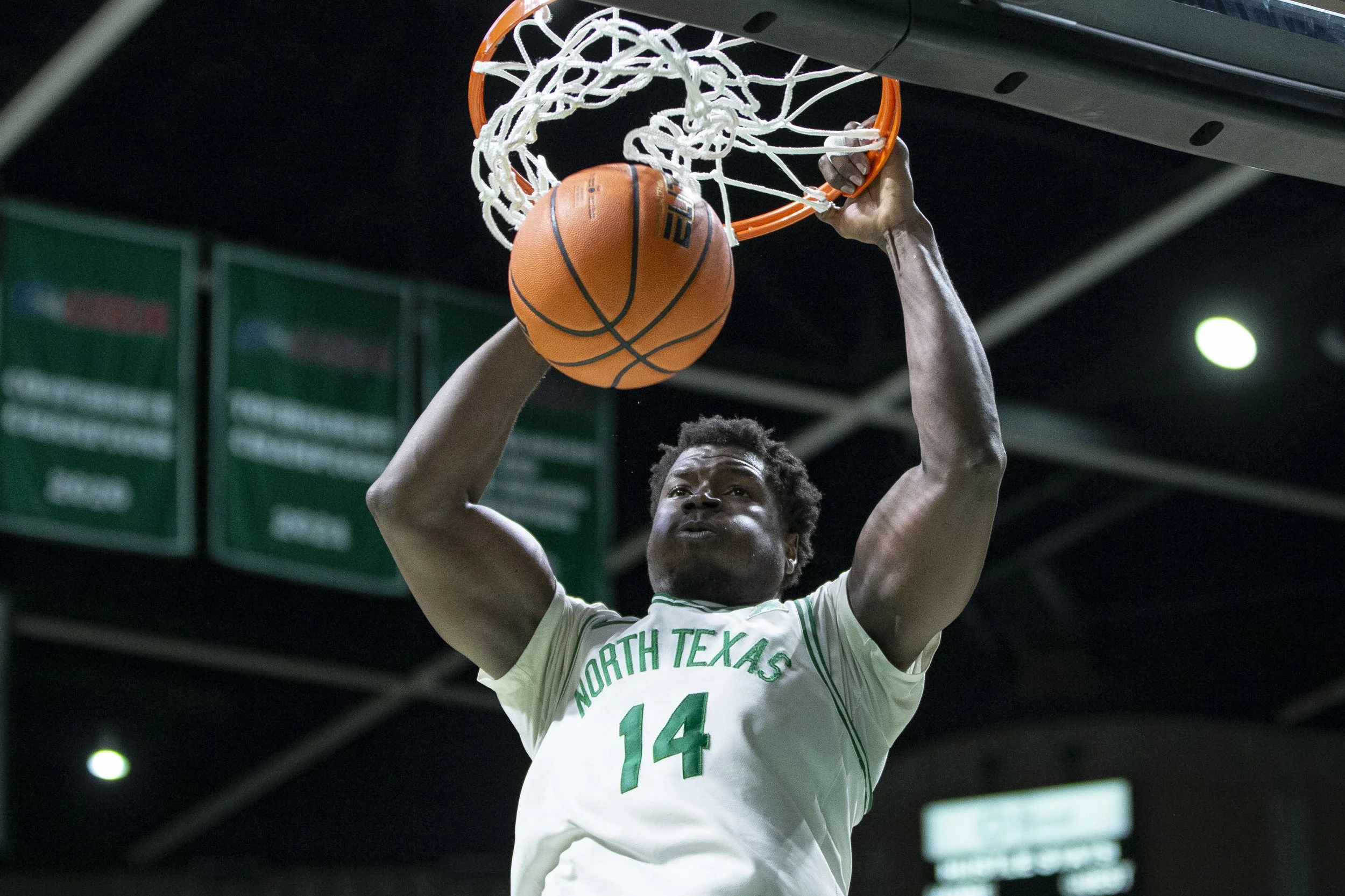 North Texas forward Moulaye Sissoko (14) dunks the ball during an NCAA college basketball game between North Texas and Florida Atlantic at The Super Pit in Denton, Texas on January 26, 2025. The Mean Green defeated the Owls, 77-64. (Daniel McGregor-Huyer/ZUMA Press Wire)