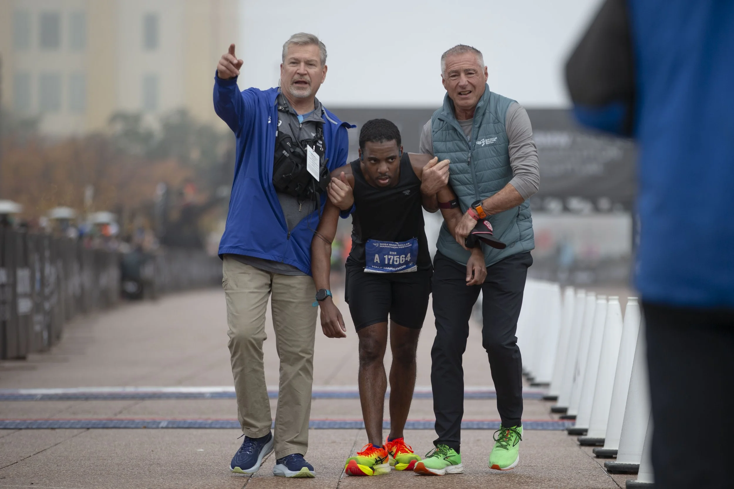 Ryan Burrell (middle) is helped by marathon staff during the 2024 BMW Dallas Marathon on Sunday, Dec. 15, 2024 in Dallas, Texas. (Daniel McGregor-Huyer/Zuma Press Wire)