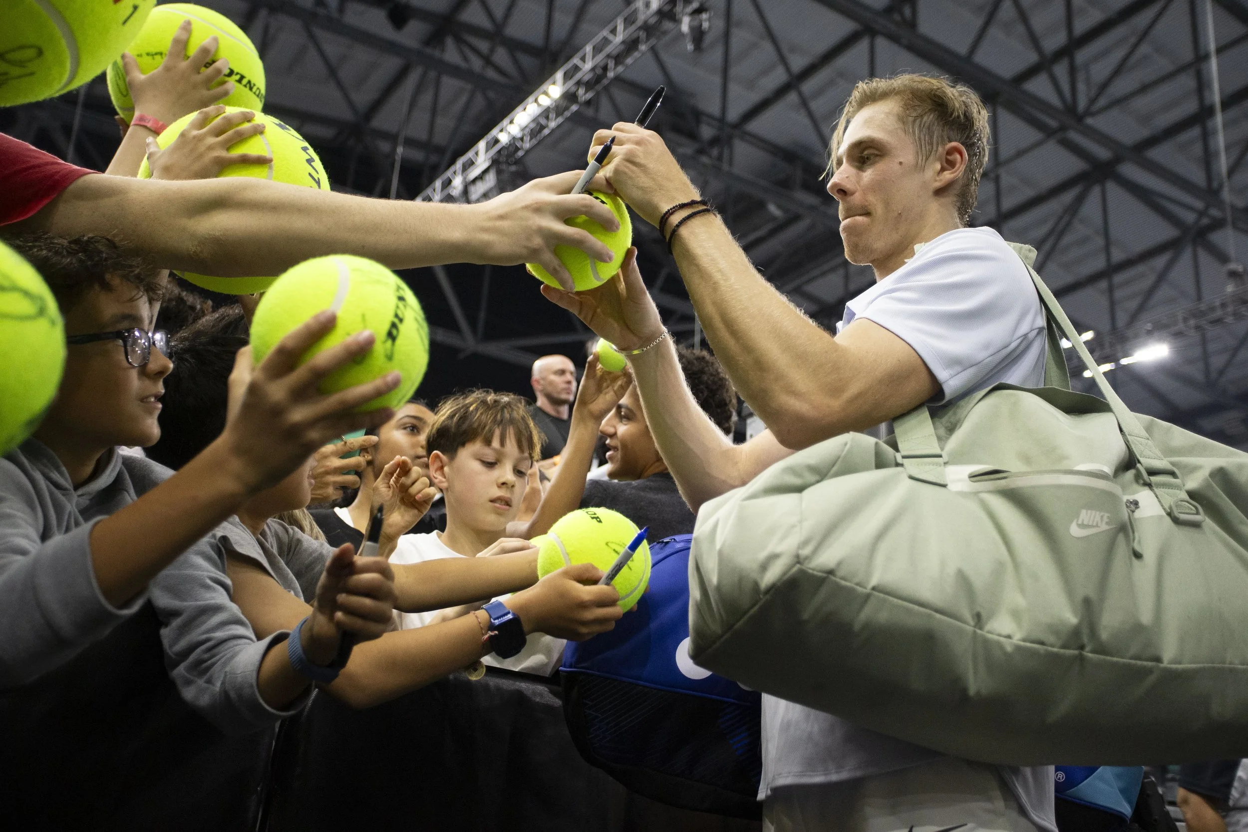 Denis Shapovalov (CAN) signs autographs during day eight of the 2025 Dallas Open at the Star on Saturday, Feb. 8 in Frisco, TX. Denis Shapovalov (CAN) defeated Tommy Paul (USA), 7:5, 6:3. (Daniel McGregor-Huyer/Zuma Press Wire)
