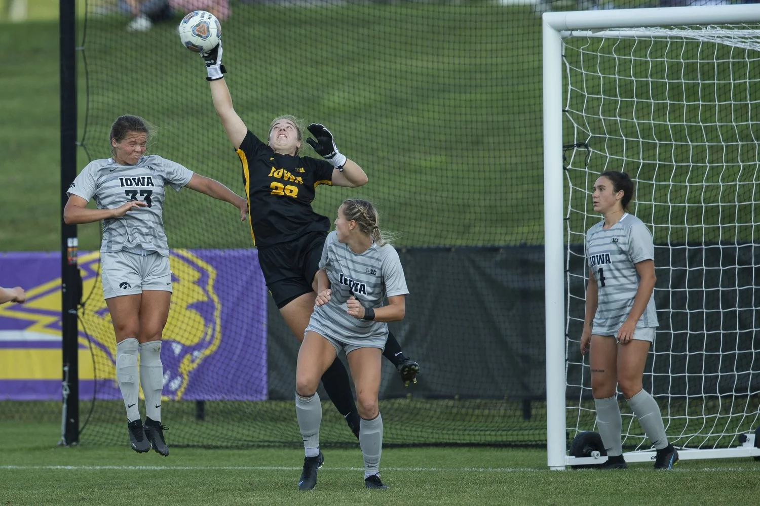Iowa goalkeeper Monica Wilhelm saves the ball during a game between Iowa and Northern Iowa at the UNI soccer field in Cedar Falls on Sept. 11, 2022. The Hawkeyes defeated the Panthers, 6-0. Wilhelm recorded two saves and played for 73:39. (Daniel McGregor Huyer/The Daily Iowan)