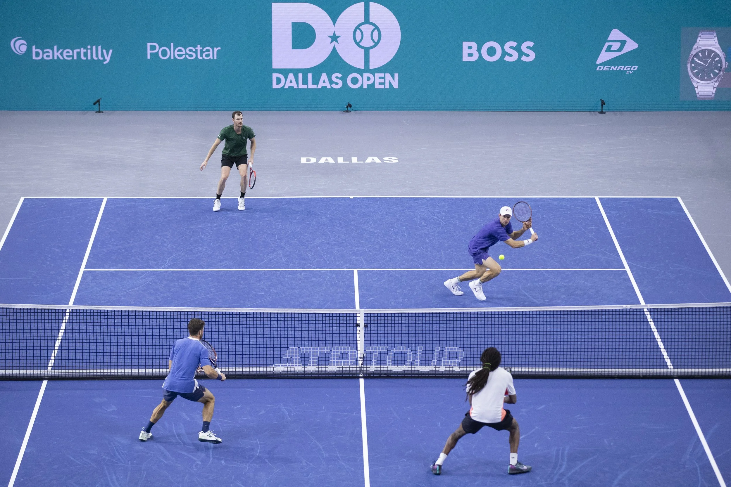 John Peers (GBR) returns with a forehand in a doubles semifinal match against Christian Harrison (USA)/ Evan King (USA) during day eight of the 2025 Dallas Open at the Star in Frisco, TX. Christian Harrison (USA)/ Evan King (USA) defeated Jamie Murray (GBR)/ John Peers (GBR), 6:4, 6:2. (Daniel McGregor-Huyer/Zuma Press Wire)