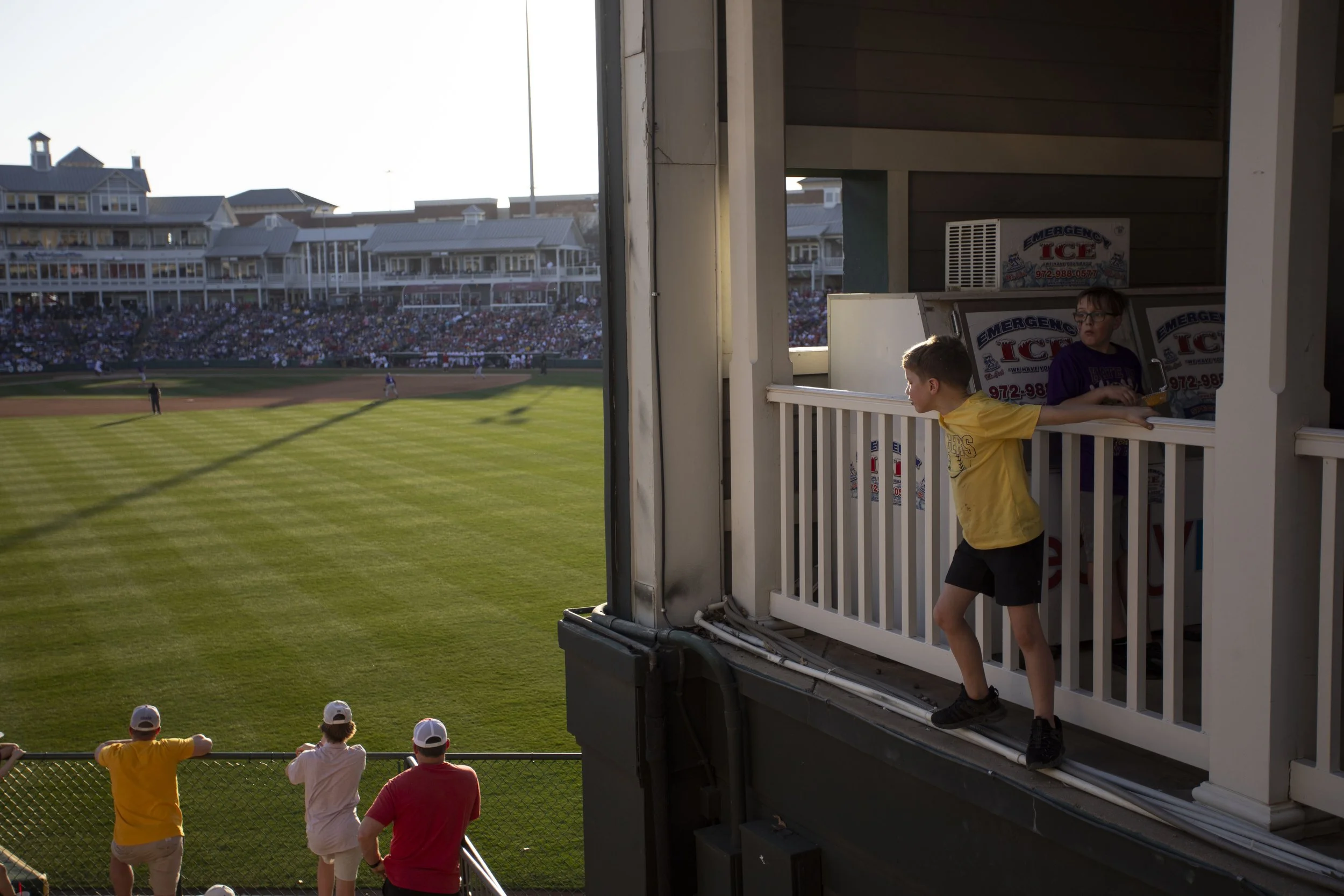 A kid climbs on the wall during a game between LSU and Nebraska at the Frisco Baseball Classic at Riders Fields on Saturday, March 2, 2025 in Frisco, Texas. The Tigers defeated The Cornhuskers, 11-6.