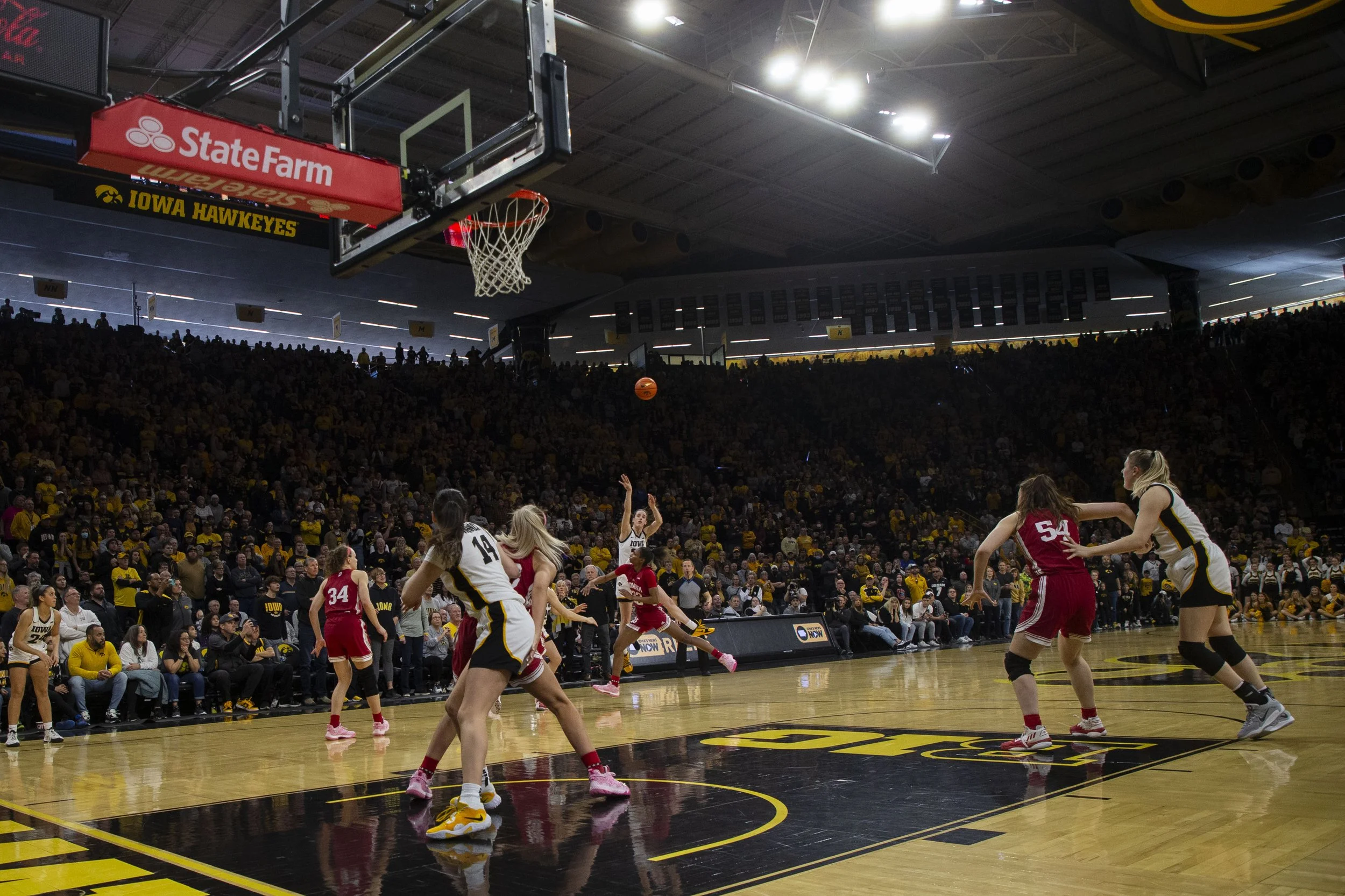 Iowa guard Caitlin Clark shoots a buzzer-beater during a basketball game between No.9 Iowa and No. 2 Indiana at Carver-Hawkeye Arena in Iowa City on Sunday, Feb. 26, 2023. The Hawkeyes defeated the Hoosiers, 86-85. Clark recorded 34 points, nine defensive rebounds, and nine assists. (Daniel McGregor-Huyer/The Daily Iowan)