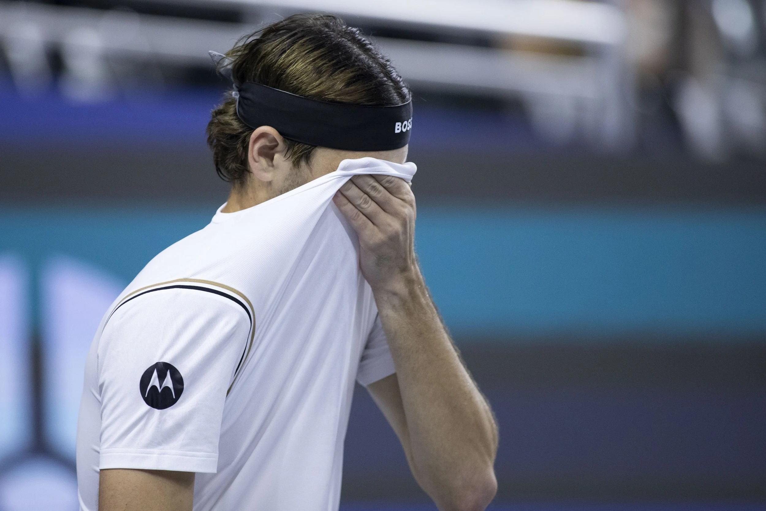 Taylor Fritz (USA) puts his shirt over his face in a singles match against Denis Shapovalov (CAN) during day six of the 2025 Dallas Open at the Star on Thursday, Feb. 6, 2025 in Frisco, TX. Shapovalov (CAN) defeated Fritz (USA), 2:6, 6:3, 7:6. (Daniel McGregor-Huyer/Zuma Press Wire)