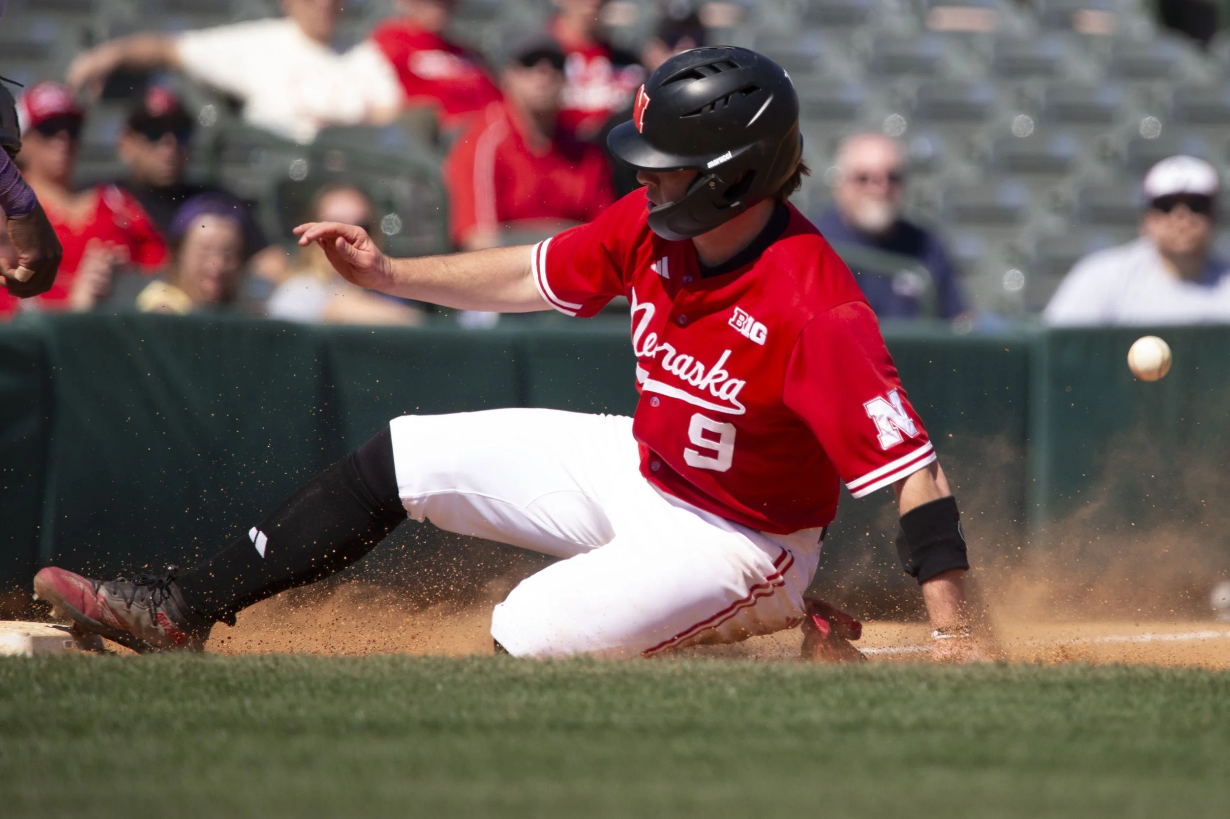 Nebraska infielder Rhett Stokes(9) slides into third base during a game between Kansas State and Nebraska at the Frisco Baseball Classic at Riders Fields on Sunday, March 3, 2025 in Frisco, Texas. The Wildcats defeated the Cornhuskers, 9-6. (Daniel McGregor-Huyer/Zuma Press Wire)
