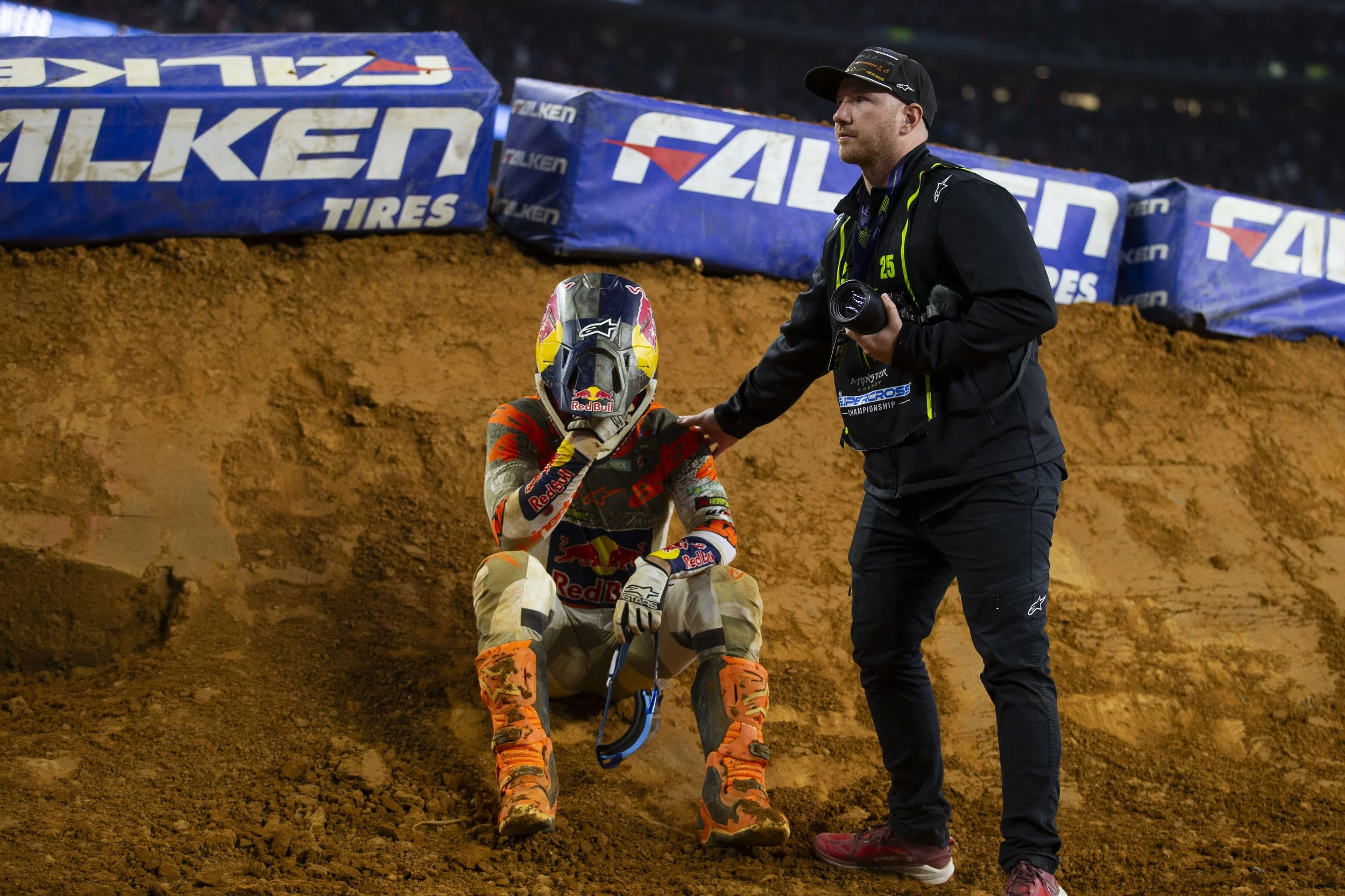 Chase Sexton (4) reacts after finishing third in a 450 race at the Monster Energy AMA Supercross Championships at AT&T Stadium on Saturday, February 22, 2025 in Arlington, Texas. (Daniel McGregor-Huyer/Zuma Press Wire)