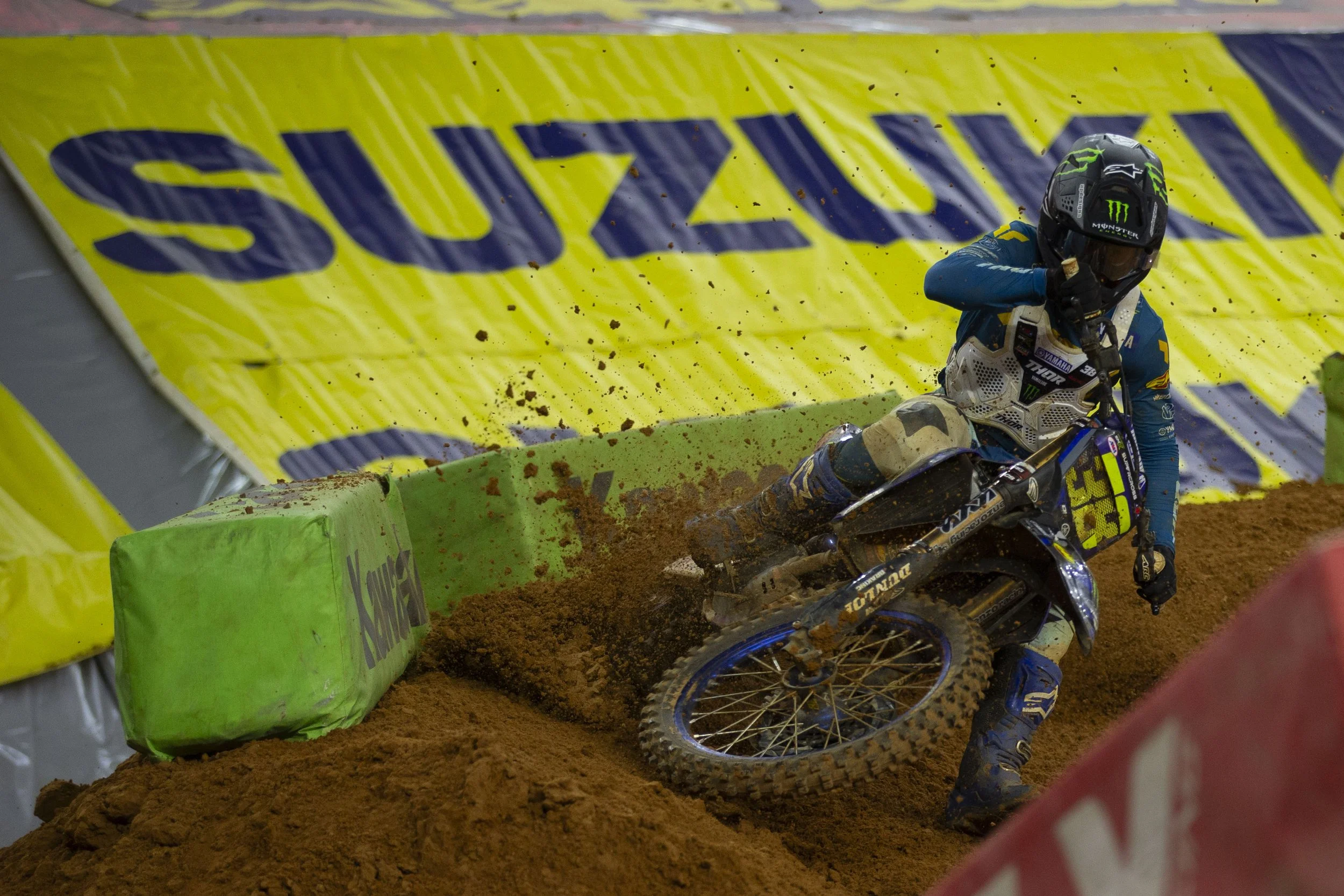 Haiden Deegan (38) makes turn during a 250 race at the Monster Energy AMA Supercross Championships at AT&T Stadium on Saturday, February 22, 2025 in Arlington, Texas. (Daniel McGregor-Huyer/Zuma Press Wire)