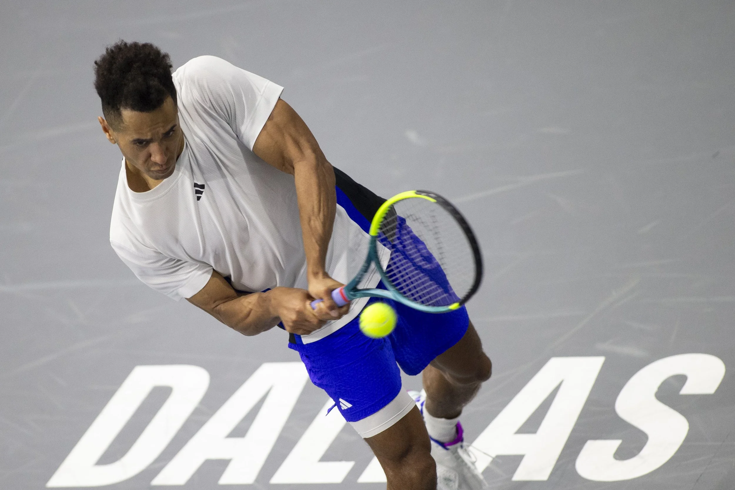 Michael Mmoh (USA) returns with a backhand in a singles match against Roberto Carballes Baena (ESP) during day five of the 2025 Dallas Open at the Star in Frisco, TX. Mmoh (USA) defeated Baena (ESP), 6:1, 3:6, 6:4. (Daniel McGregor-Huyer/Zuma Press Wire)