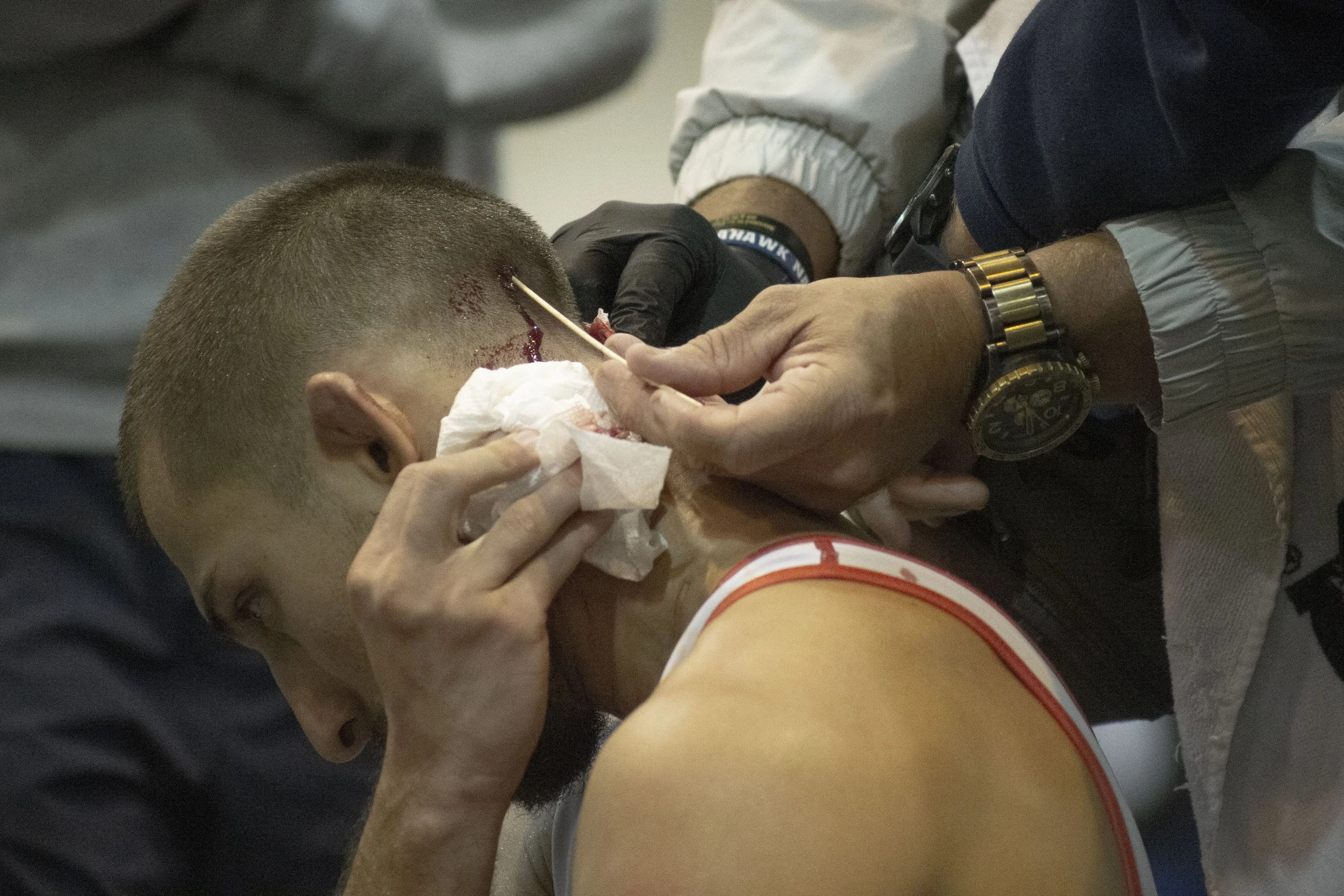Medical staff tend to a cut on Vito Arujau at session three of the Non-Olympic Weight World Team Trials at CHI Health Center on Sunday, Sept. 15, 2024 in Omaha, Nebraska. (Daniel McGregor-Huyer/Zuma Press Wire)