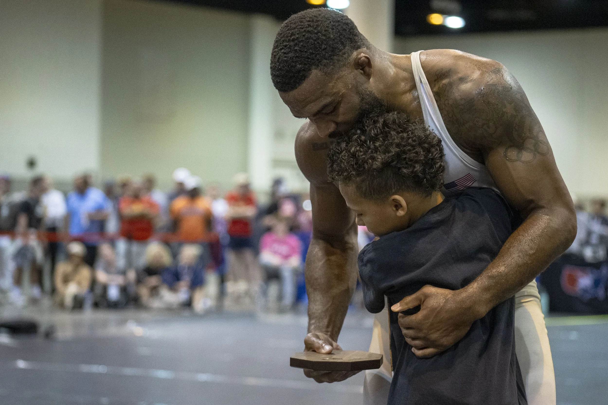 Jordan Burroughs hugs his son Beacon after winning his 79kg final match at session four of the Non-Olympic Weight World Team Trials at CHI Health Center on Sunday, Sept. 15, 2024 in Omaha, Nebraska.  (Daniel McGregor-Huyer/Zuma Press Wire) View fullsize