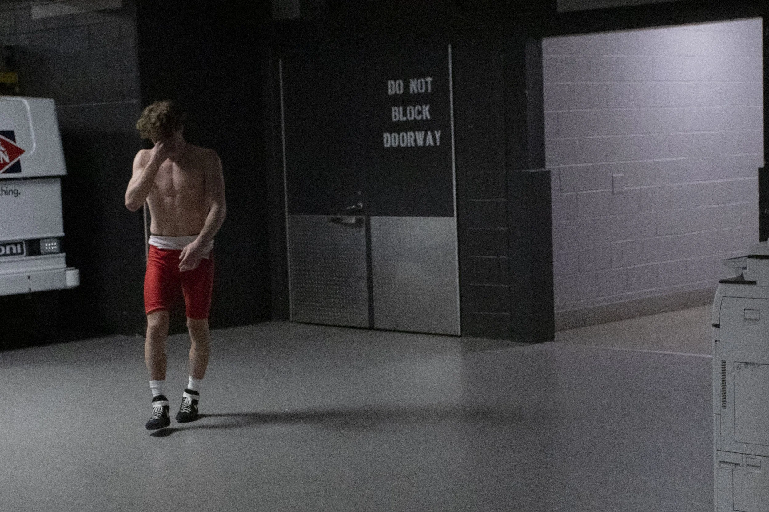 Spencer Lee takes off singlet after winning a 57kg semifinal match over Josh Rodriguez at the 2023 Senior Nationals at the Fort Worth Convention Center in Fort Worth, Texas on Saturday, Dec. 16, 2023.