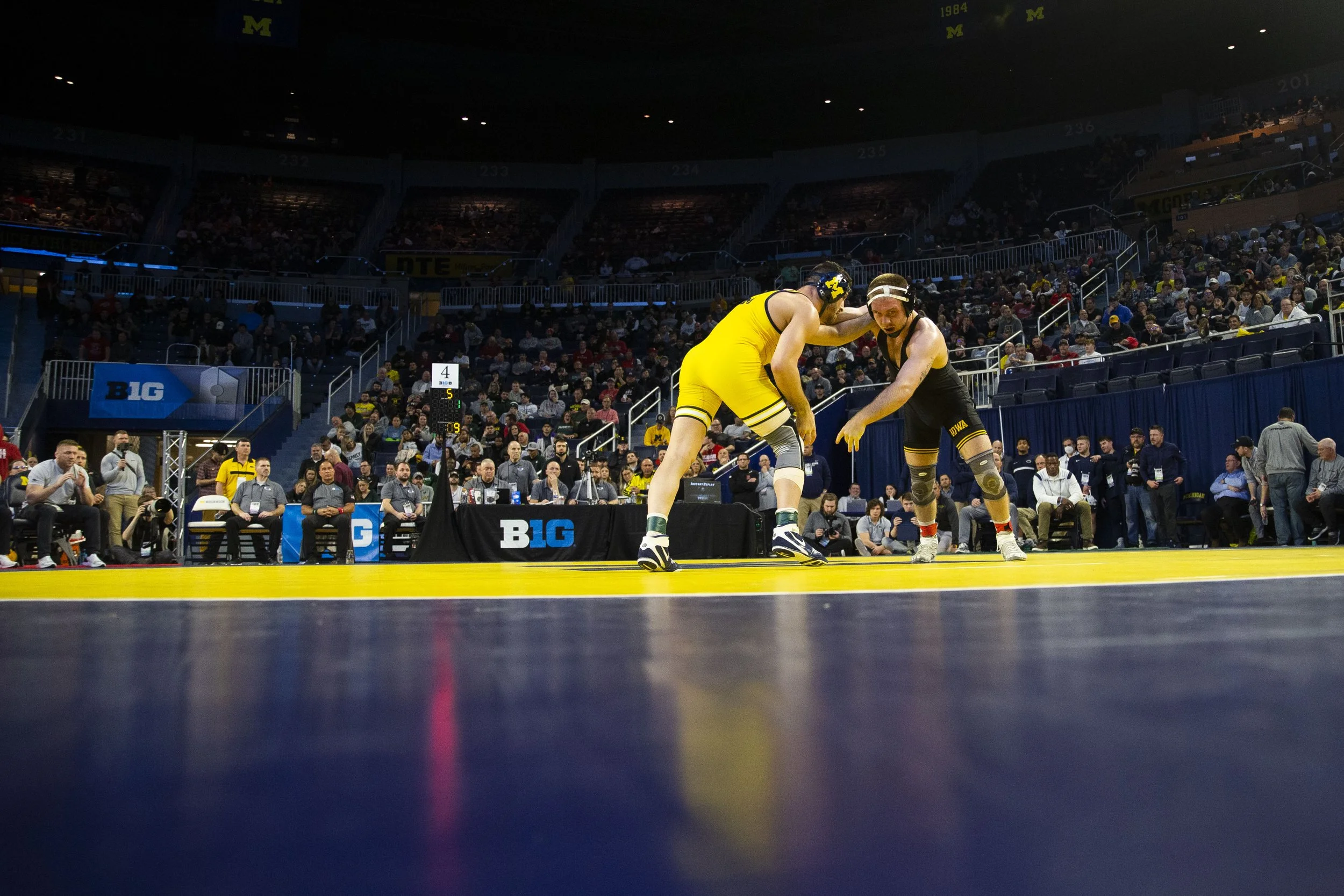 No. 3 seeded 165-pound Iowa's Patrick Kennedy wrestles Michigan’s No.2 Cameron Amine during session two of the Big Ten Wrestling Championships at Crisler Center in Ann Arbor, Mich. on Saturday, March. 4, 2023. Kennedy defeated Amine, 3-2. (Daniel McG
