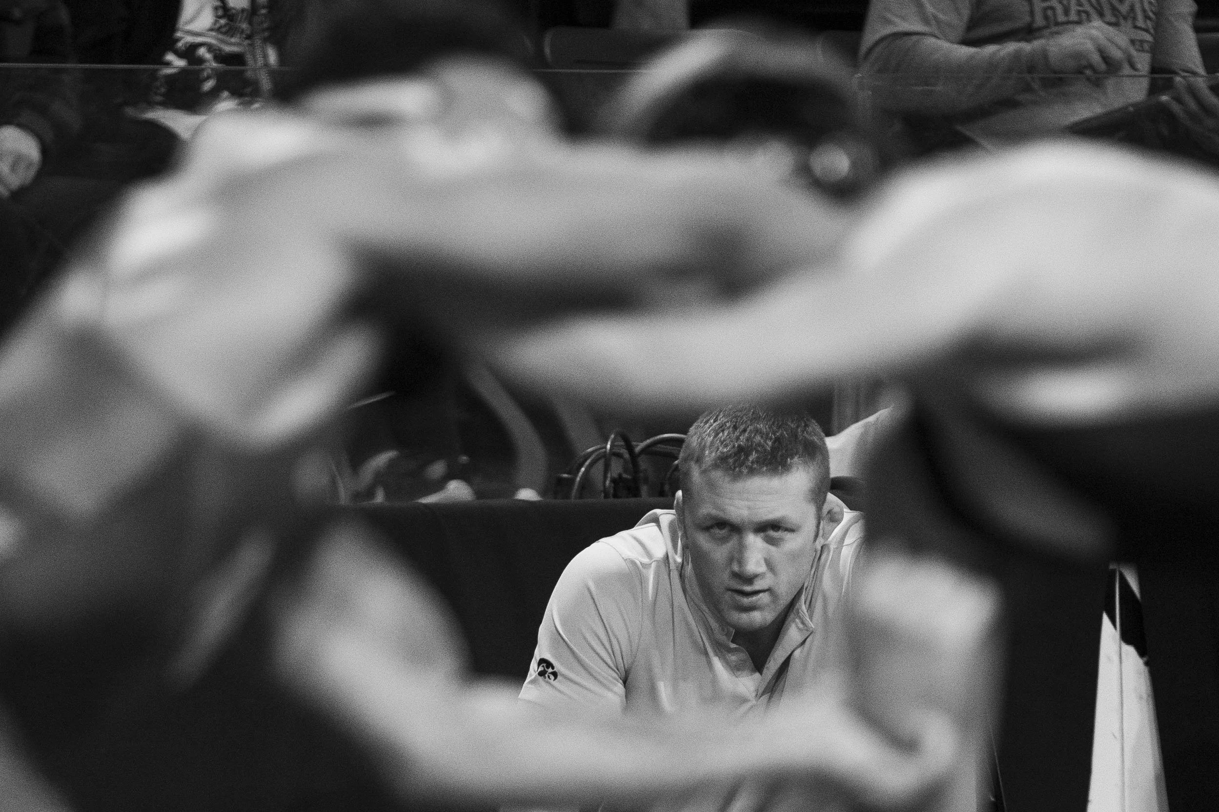 Iowa assistant head coach Ryan Morningstar watches a match between Iowa 149-pound Caleb Rathjen and Ohi State unattached wrestler Anthony Echmendia during day two of the 2022 Soldier Salute College Wrestling Tournament at Xtream Arena in Coralville, Iowa on Friday, Dec. 30, 2022. (Daniel McGregor-Huyer/The Daily Iowan)