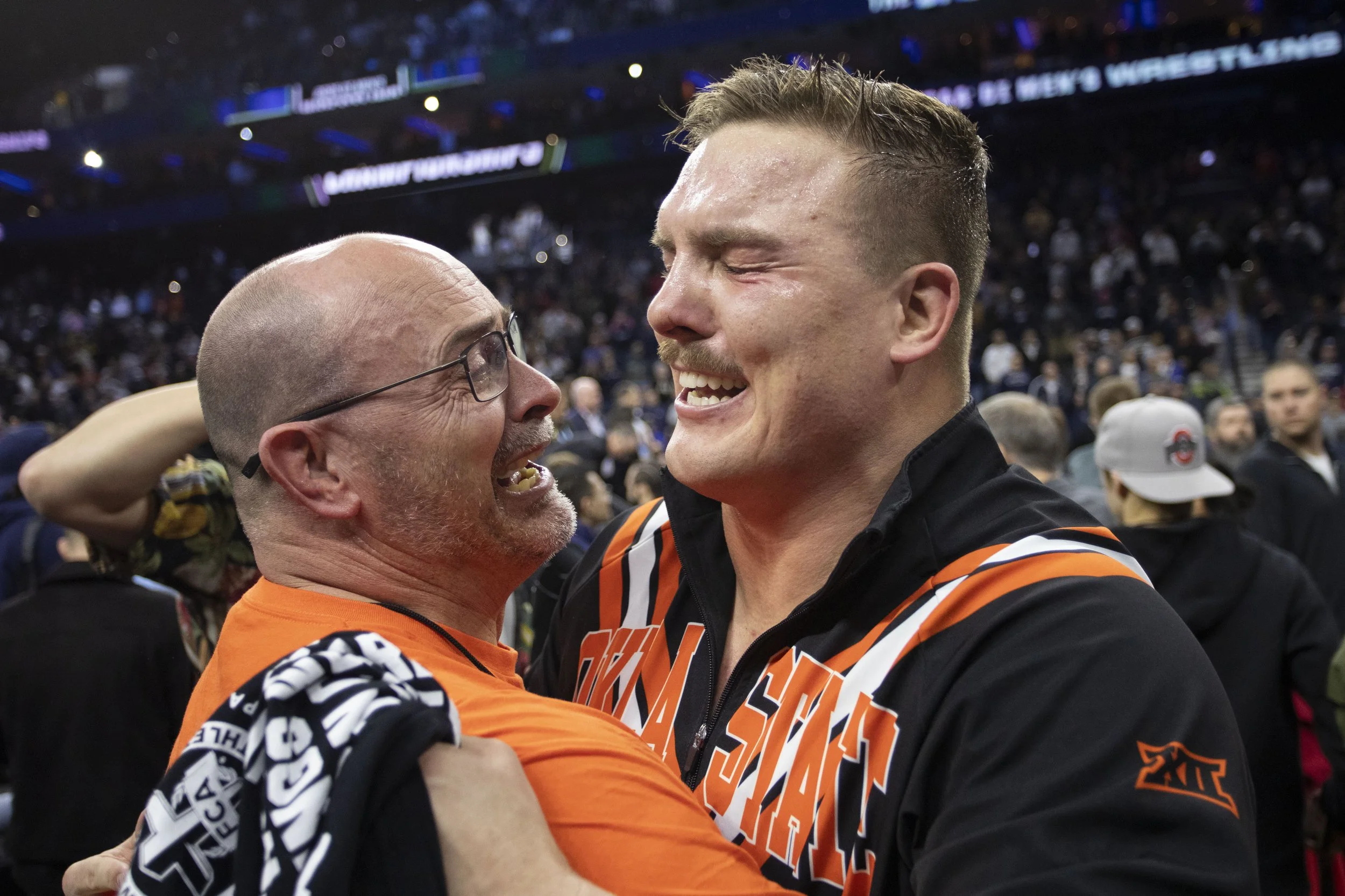 Oklahoma State's Wyatt Hendrickson (right) hugs his father Todd (left) during session six of the 2025 NCAA Division I wrestling championships at Wells Fargo Center on Saturday, March 22, 2025 in Philadelphia, Pennsylvania. Hendrickson upset Minnesota